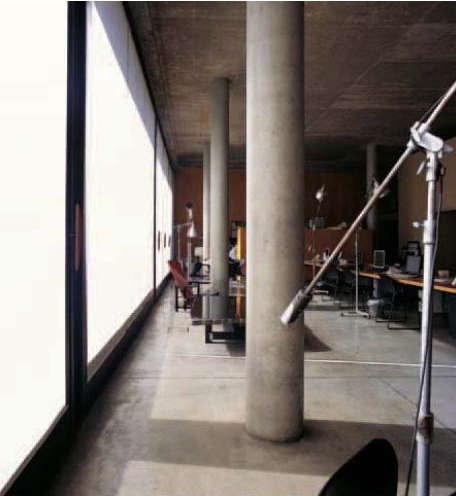 La gran flexibilidad de las plantas se verifica en la gran variedad de funciones: cocheras, estudios y viviendas sin apeos estructurales, a partir de una estructura de losas sin vigas con columnas redondas expuestas en todos los ambientes con capiteles invertidos. Los artefactos de luz premoldeados en hormigón durante la obra se incorporaban en el encofrado y quedaron incluidos en las losas, que no recibieron ningún tratamiento posterior al hormigonado. Memoria de los autores