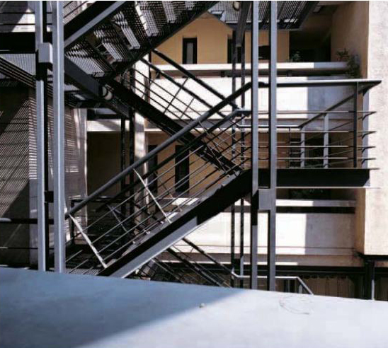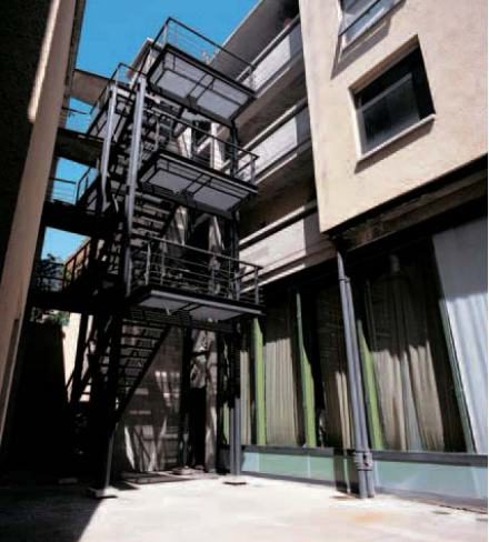 El patio central distribuye el movimiento del público articulando y resolviendo accesos y circulaciones verticales y horizontales, que le dan gran vitalidad al conjunto.El ascensor es la bisagra a partir de la cual se rota el cuerpo del contrafrente, logrando en el patio una mayor captación solar y una espacialidad que se continúa